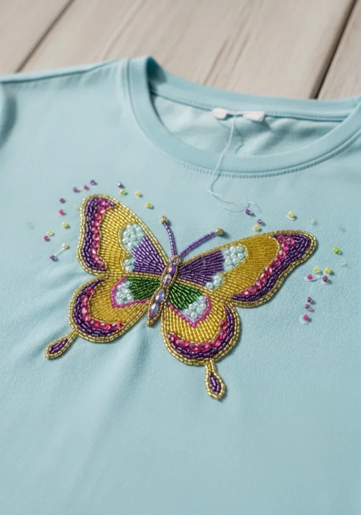 This soft mint blue T shirt features a stunning butterfly stitched with vibrant bead embroidery. The wings are filled with golden yellow beads, then accented with curved sections of purple, pink, green, and icy blue beads that create a layered stained glass effect. Tiny translucent beads add sparkle within the wing patterns, while slim beaded outlines define each section beautifully. The body and antennae are carefully shaped with coordinating beads, giving the whole design a graceful and dimensional look against the smooth cotton fabric.