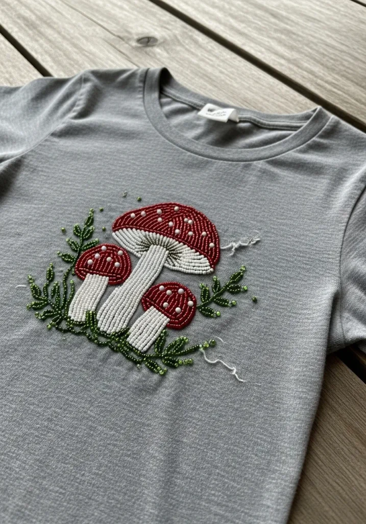 This soft gray T shirt features a charming trio of red and white mushrooms stitched with detailed bead embroidery. The caps are filled with deep red seed beads and dotted with raised white bead spots for that classic storybook look. The stems are created with slim ivory beads arranged in neat vertical rows, giving them a textured, ribbed effect. Tiny green beaded leaves and grass accents frame the mushrooms, adding a fresh woodland vibe against the neutral fabric.