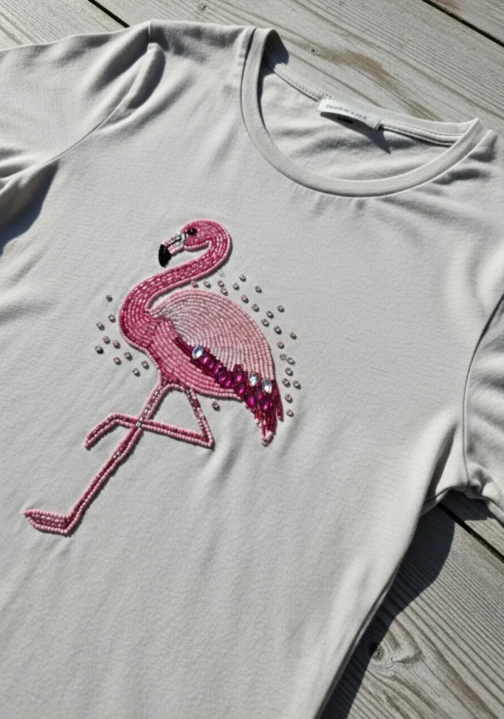 I love how chic and slightly tropical this feels. If you are into fun statement motifs, a flamingo is such a stylish choice. The curved neck and rounded body make it surprisingly satisfying to stitch, almost like drawing with beads. It is the kind of tee that instantly makes a casual outfit feel fresh, feminine, and a little bit glam.