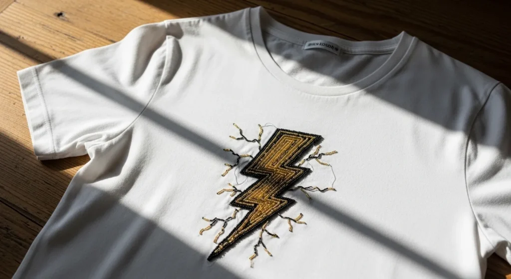 I love how personal this kind of design can feel. If you are into astrology or celestial themes, stitching your own zodiac sign onto a tee is such a fun idea. The layout is simple and easy to sketch, which makes it very beginner friendly. It turns a classic dark shirt into something meaningful and chic without feeling overdone.