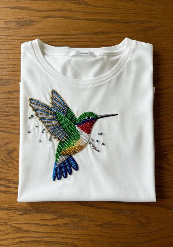 This classic white T shirt features a stunning hummingbird brought to life with detailed bead embroidery. The body is stitched in rich green, blue, red, and gold seed beads that create a layered, textured look. The wings are outlined with metallic beads and filled with shades of blue and teal that shimmer in the light. Tiny scattered beads around the bird add movement, almost like sparkling drops in mid air. The raised beadwork gives the design depth and a beautiful handcrafted finish against the soft cotton fabric.