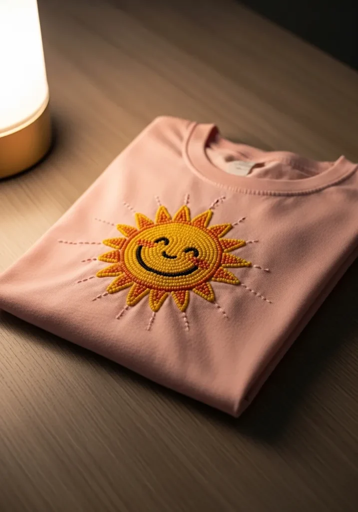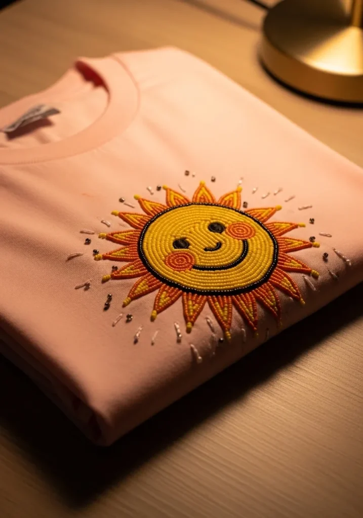This soft blush pink T shirt features a cheerful sun design stitched entirely with bright yellow and warm orange seed beads. The center of the sun is filled with neat circular rows of beads that create a slightly raised, textured surface. The rays extend outward in pointed shapes, each outlined and filled with golden tones for extra dimension. A simple black beaded smile and tiny stitched blush details give the sun a playful personality. The contrast between the pastel fabric and the vibrant beadwork makes the whole piece glow.