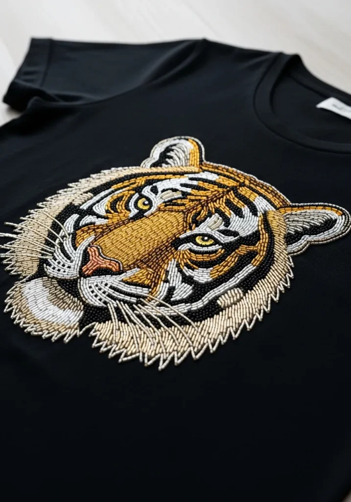 This black T shirt features a striking tiger face created entirely with detailed bead embroidery. Slim bugle beads and seed beads in shades of gold, ivory, black, and warm brown are carefully stitched to form layered fur textures. The eyes are highlighted with yellow and dark beads that give them an intense gaze. Fine bead lines shape the whiskers and stripes, adding depth and movement. The raised beadwork pops beautifully against the dark cotton fabric, making the design feel dramatic and luxe.