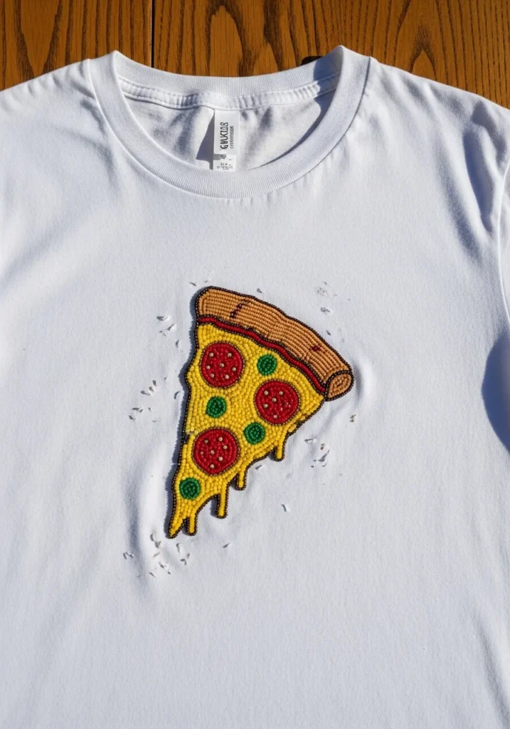 Playful Pizza Slice Bead Embroidery T Shirt
