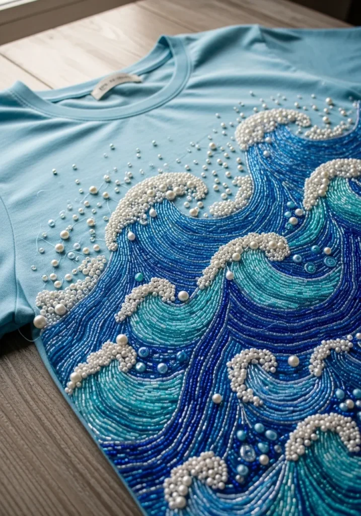 I am completely obsessed with how bold this looks on a simple tee. If you are into coastal vibes or beachy details, this kind of wave design is such a fun statement to try. It looks intricate, but working in curved rows is surprisingly calming once you get into it. The mix of blues and pearly whites makes it feel artistic and chic, yet still perfect for everyday casual outfits.
