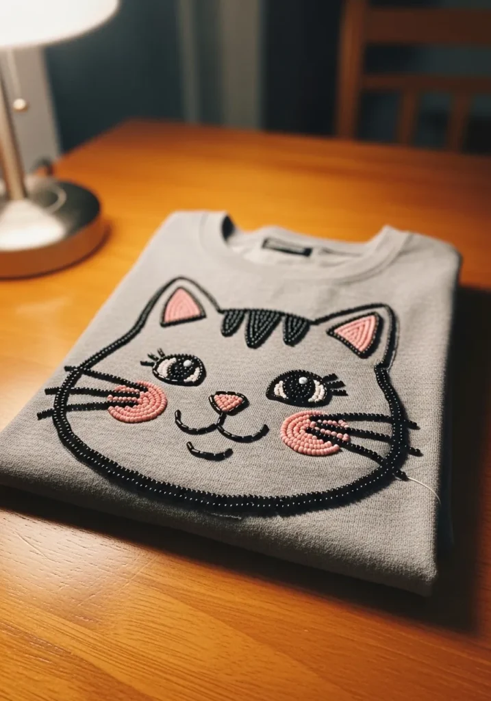 I have such a weakness for cute animal designs, and this one totally wins me over. If you are into playful and feminine details, a beaded cat face is such a fun project to try. The shapes are simple and forgiving, which makes it feel beginner friendly even though it looks impressive. It turns a basic tee into something that feels personal, adorable, and perfect for casual days.