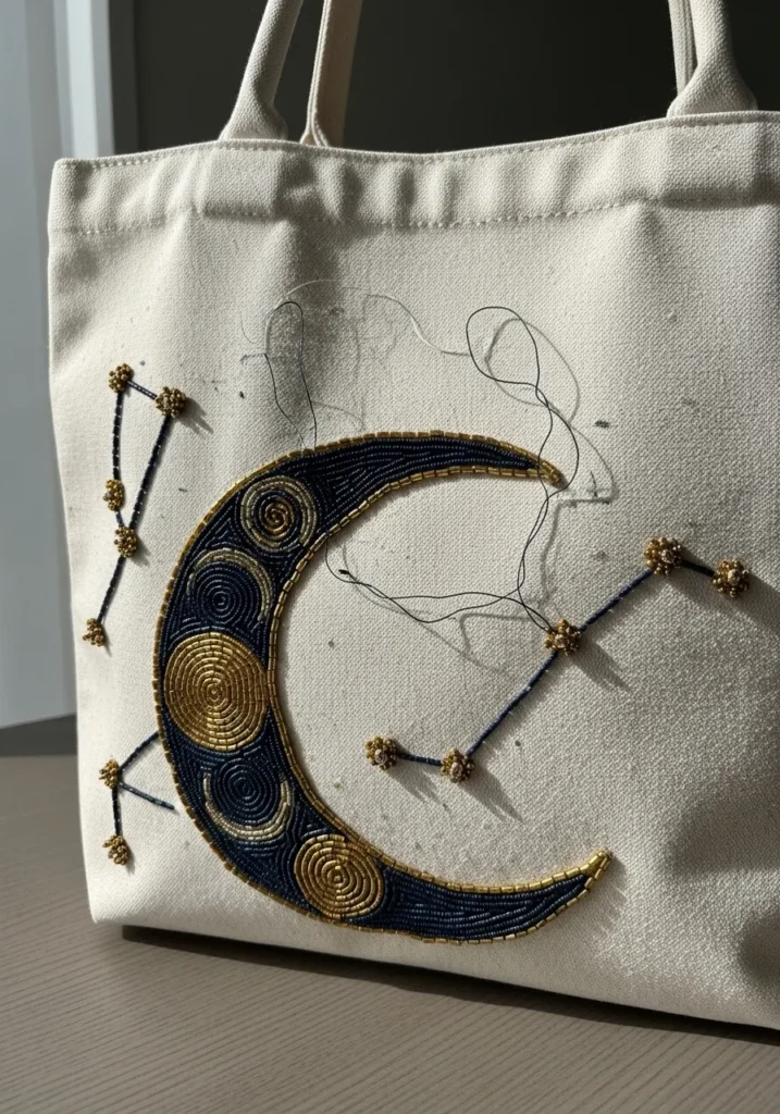 This chic beaded embroidery tote bag features a stunning crescent moon design stitched onto natural canvas fabric. The moon is filled with rich navy blue seed beads and detailed with swirling gold bead patterns that look like tiny galaxies. Delicate beaded constellation lines extend around it with small clustered star beads for extra sparkle. The mix of metallic gold and deep blue creates a dreamy night sky effect, while the textured beadwork adds beautiful dimension against the soft, neutral tote.