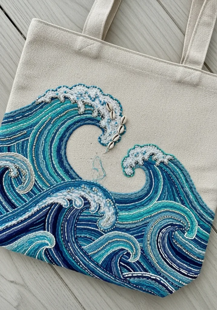 This chic beaded embroidery tote bag features dramatic curling ocean waves stitched in layered shades of turquoise, teal, navy, and seafoam. Rows of tiny seed beads follow the natural flow of the water, creating beautiful movement and texture across the canvas. The foamy crests are highlighted with white beads and small pearl like accents, while a cluster of real shells is stitched into one wave for an unexpected coastal touch. The mix of flowing lines and dimensional details makes the design feel alive and dynamic.