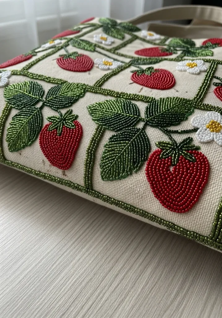 This chic beaded embroidery tote bag is covered in the cutest strawberry garden pattern stitched onto natural canvas. Plump red strawberries are outlined with tiny glossy seed beads, while rich green beaded leaves create beautiful texture and dimension. Little white flowers with golden bead centers are scattered between the vines, all framed by neat green beaded lines that form a charming lattice design. The mix of bold reds, fresh greens, and crisp white against the neutral fabric makes the whole bag feel bright, cheerful, and totally eye catching.