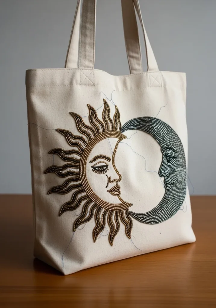 This chic beaded embroidery tote bag features a stunning sun and moon duo stitched onto natural cream canvas. The sun is outlined in warm bronze and gold beads with flowing rays that add movement and texture, while the crescent moon is filled with deep forest green beads arranged in smooth curved lines. Both celestial faces are delicately detailed with fine stitched features, giving them a dreamy and slightly mystical expression. The contrast between the warm metallic tones and the darker moon creates a balanced yet eye catching design.