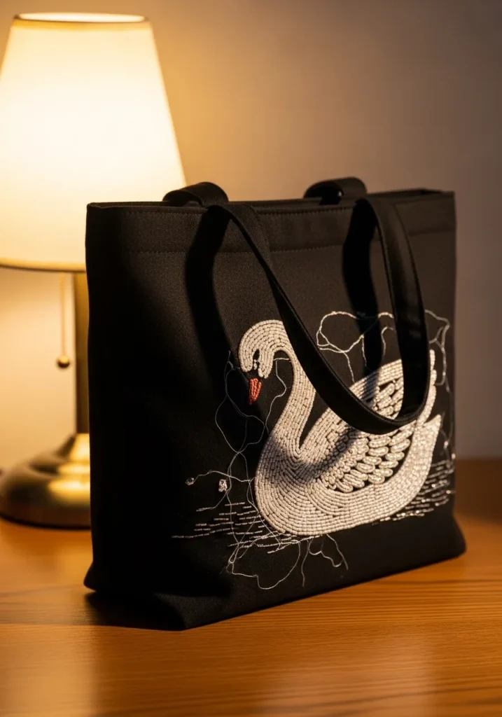 This chic beaded embroidery tote bag features a graceful white swan stitched onto deep black fabric for a bold and dramatic look. The swan is created with layers of tiny white seed beads that form curved feather details and soft wing textures. A small pop of red beads highlights the beak, while fine white thread lines suggest gentle ripples in the water beneath it. The contrast between the matte black canvas and the shimmering beadwork makes the design feel polished, modern, and quietly luxurious.