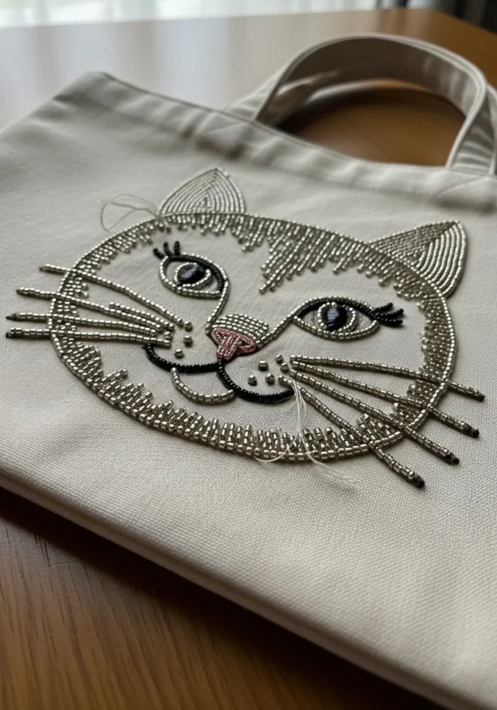This chic beaded embroidery tote bag features an oversized cat face stitched onto a soft cream canvas base. Tiny silver seed beads outline the ears, cheeks, and forehead, creating a shimmering fur effect with beautiful texture. The eyes are detailed with dark beads for depth and glossy highlights, while a touch of blush pink beads forms the little nose. Long beaded whiskers stretch outward, adding movement and personality. The neutral fabric paired with metallic beadwork gives the whole design a modern yet playful feel.