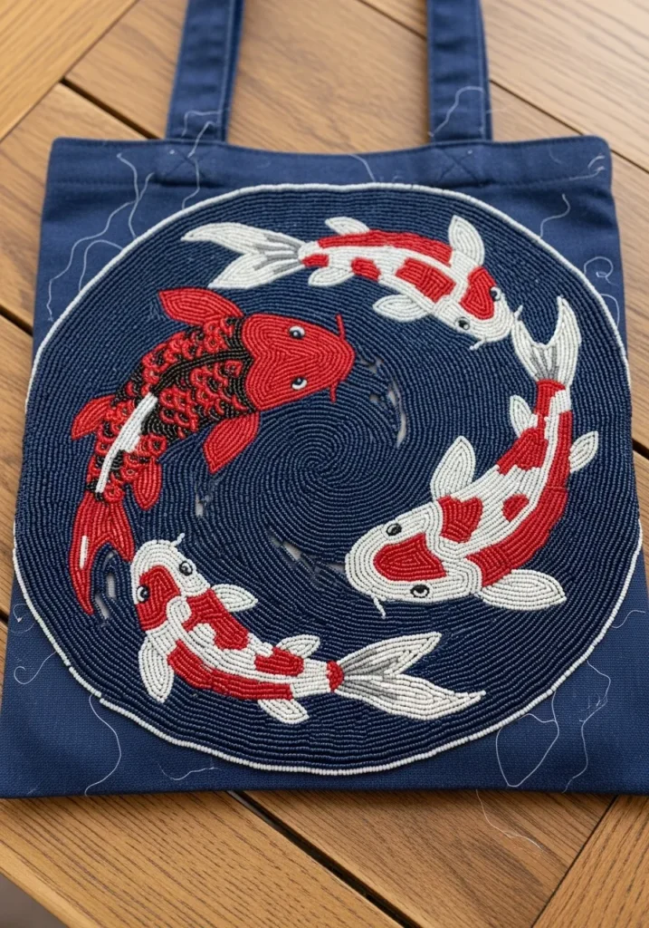 This chic beaded embroidery tote bag features four vibrant koi fish stitched in a graceful circular formation on deep navy fabric. Tiny red, white, and black seed beads create detailed scales, flowing fins, and expressive little eyes. The fish swim around a tightly stitched spiral center that mimics rippling water, giving the design beautiful movement and depth. The bold red and crisp white beads pop dramatically against the dark background, making the whole tote feel artistic and striking.