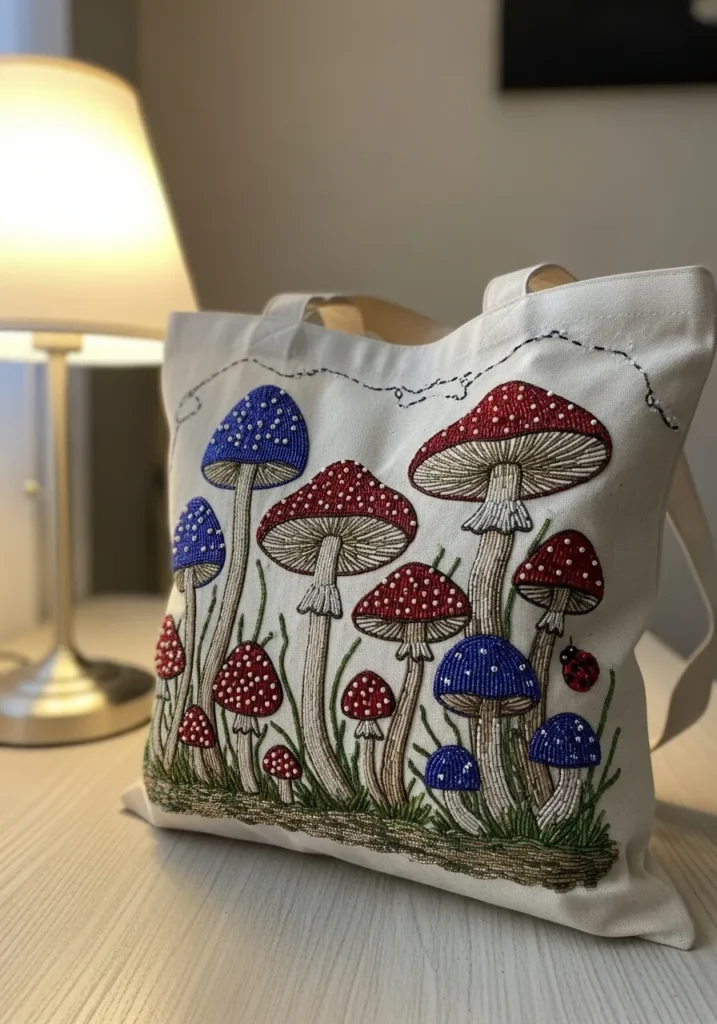 This chic beaded embroidery tote bag features a charming cluster of red and blue toadstool mushrooms stitched onto soft cream canvas. The mushroom caps are filled with tiny glossy beads in rich crimson and deep cobalt, each dotted with petite white bead spots for that classic fairy tale look. Slender beige and ivory stitches form the textured stems, while fine green thread and beadwork create grassy details along the base. A tiny beaded ladybug tucked near the mushrooms adds the sweetest little surprise.