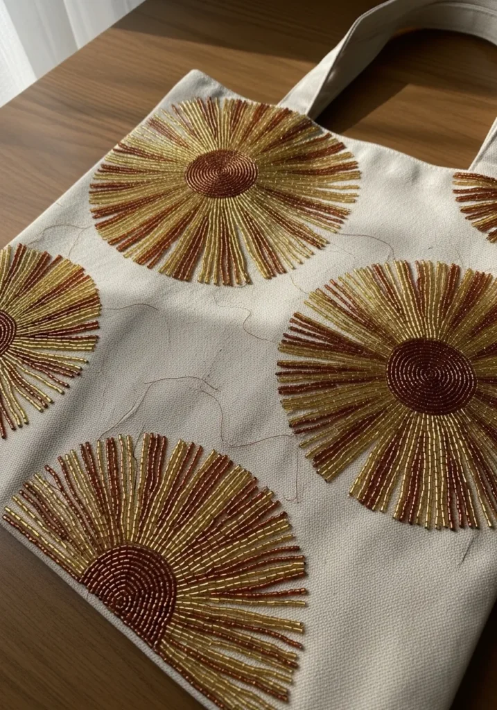 This chic beaded embroidery tote bag features bold sunburst motifs stitched onto a soft cream canvas base. Each circular center is densely filled with warm bronze beads arranged in tight spirals, while long rays of gold and amber bugle beads radiate outward in alternating tones. The layered bead lengths create gorgeous texture and subtle shimmer that catches the light beautifully. The repeated sun shapes give the bag a balanced, graphic look that feels modern yet inspired by vintage art.