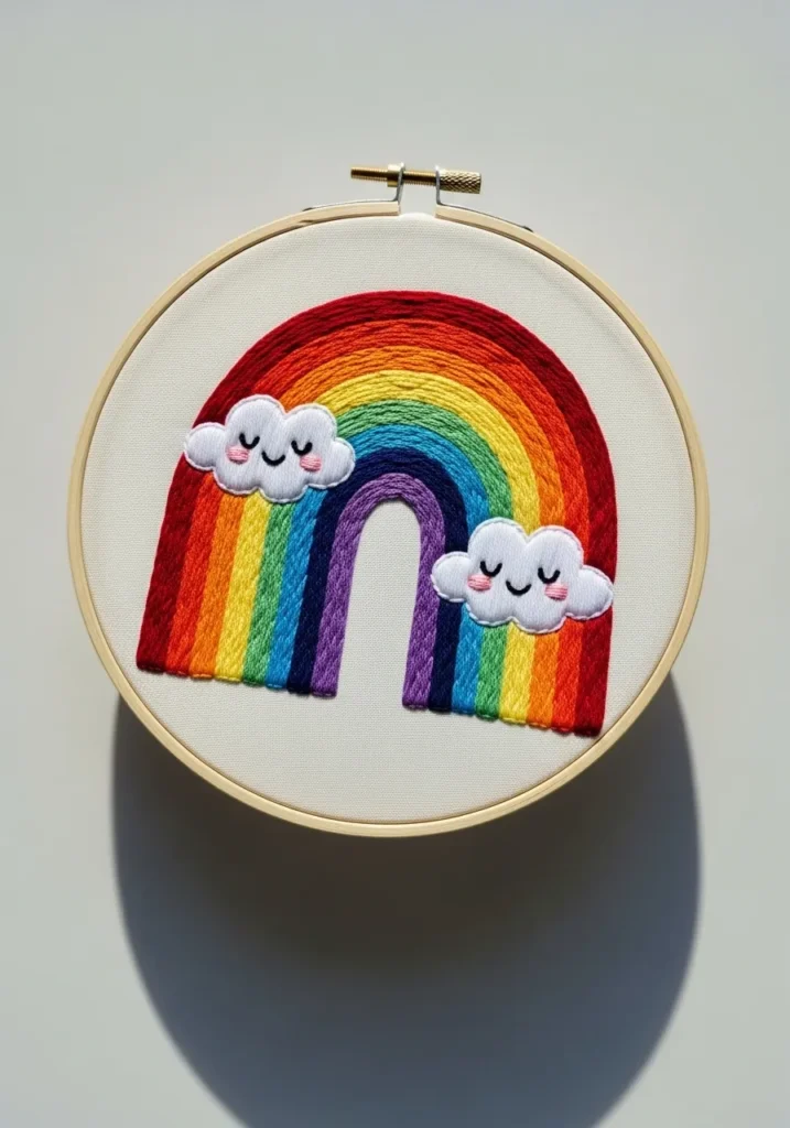 I think rainbows never go out of style. They are bright, happy, and instantly uplifting. This is the kind of project that feels joyful to stitch and even more joyful to display.