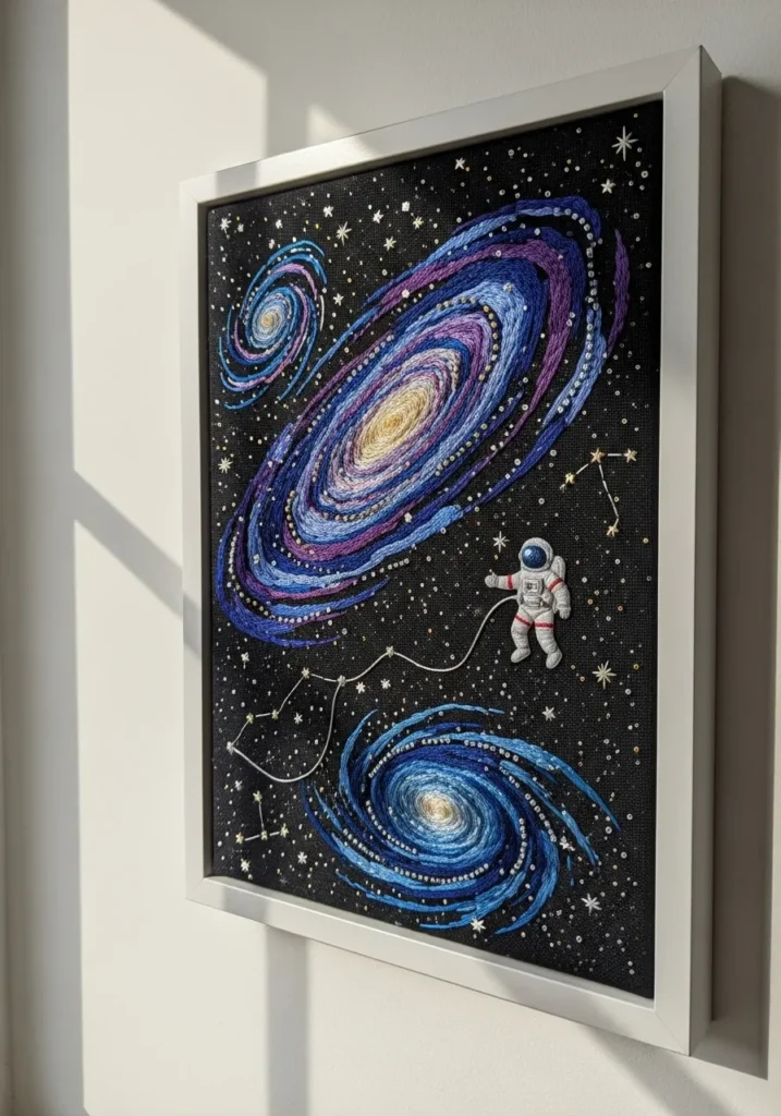 This striking embroidered artwork shows a swirling galaxy in deep blues and purples with bright stars scattered across a dark background. At the center, a tiny astronaut floats among spiral galaxies and delicate constellation lines stitched in light thread. The layered stitches create motion and depth, making the scene feel dynamic and bold. Framed cleanly on a wall, it instantly grabs attention.