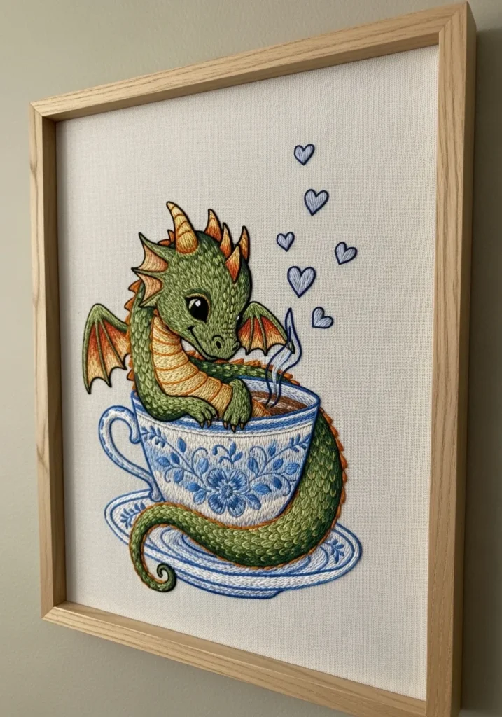 This adorable embroidered artwork features a tiny green dragon sitting inside a delicate teacup, surrounded by little stitched hearts. The dragon’s scales are detailed with layered stitches, while the teacup has soft blue patterns that add charm. The light fabric background keeps everything crisp and easy to see, framed in a simple wooden frame.