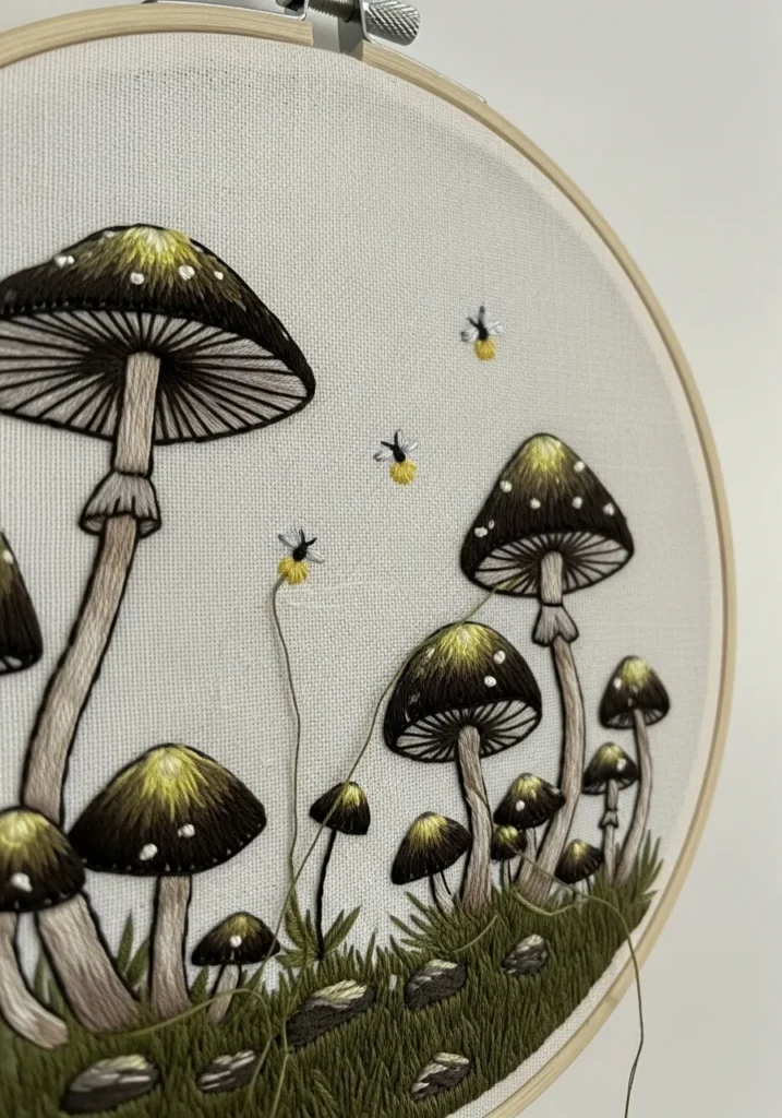 This embroidery hoop features a cluster of woodland mushrooms stitched in soft earthy tones of olive, brown, and cream. Tiny glowing fireflies float around the caps, created with delicate yellow thread that contrasts beautifully against the neutral fabric. The grass and stems are stitched with fine detail, giving the scene a gentle layered texture that feels almost storybook inspired. Framed in a simple wooden hoop on a plain wall, it feels cozy and quietly magical.