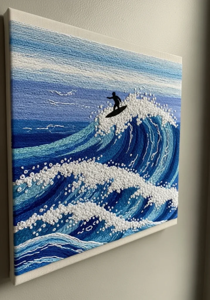 I am obsessed with how dynamic this piece feels. It shows that embroidery can go beyond hoops and become true wall art. If you want something bold and artistic that instantly stands out, an ocean wave scene is such a confident choice.