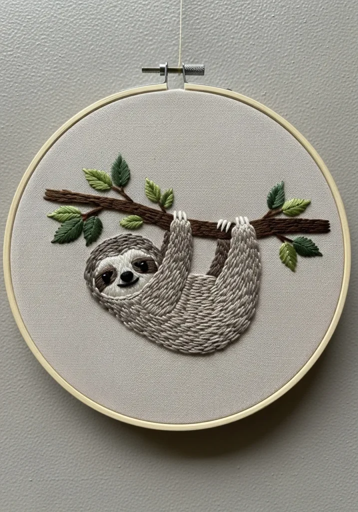 This adorable embroidery hoop shows a sleepy sloth hanging from a stitched tree branch with fresh green leaves. The soft gray and brown threads create a cozy fur texture, while the branch adds structure and balance to the circular frame. The clean background keeps the focus on the relaxed little character, making it feel light and playful on the wall.