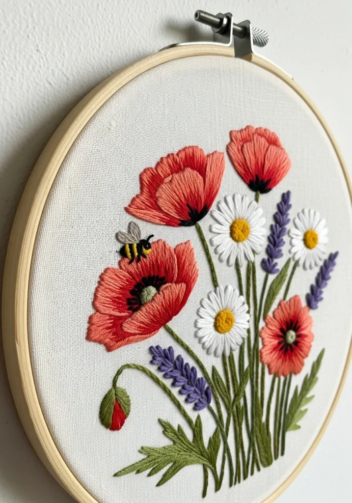 This vibrant embroidery hoop features a lively bouquet of red poppies, white daisies, and purple lavender stitched in rich, saturated threads. The layered petals and detailed leaves create depth against the light fabric background. The composition fills the hoop beautifully, making it feel abundant and fresh while still neat and balanced on the wall.