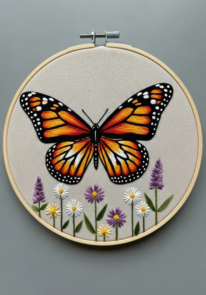 This embroidery hoop highlights a vibrant monarch butterfly with rich orange and black wings stitched in smooth, layered threads. Beneath it, delicate purple flowers and green stems add softness and contrast against the neutral background fabric. The wings are detailed with precise stitch lines that give them depth and realism, while the overall composition feels balanced and fresh. Displayed in a wooden hoop on a clean wall, it looks like a tiny piece of nature captured in thread.