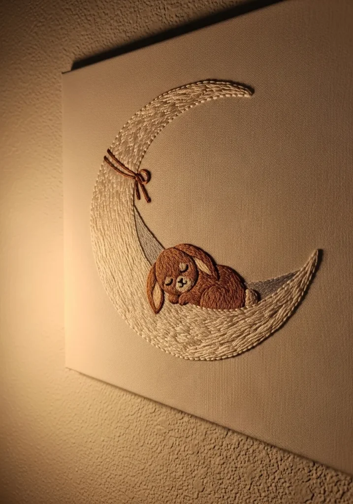 This sweet embroidered artwork features a small brown bunny resting peacefully on a crescent moon stitched in soft beige threads. The textured moon contrasts gently with the smooth background fabric, giving the piece a cozy nighttime feel. The neutral color palette keeps it calm and soothing, while the subtle stitch details in the bunny add warmth and personality. Mounted neatly in a hoop and hung on a plain wall, it feels soft and comforting.