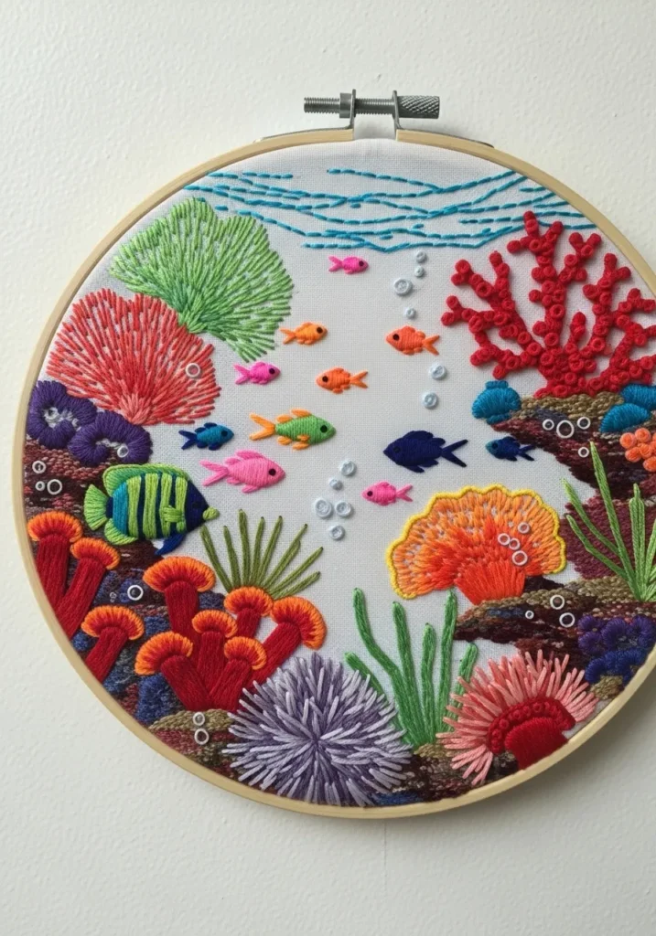 This vibrant embroidery hoop is bursting with life, featuring detailed coral formations in pink, orange, red, and purple stitched over a bright ocean blue background. Tiny fish in playful colors swim between textured sea plants and layered coral shapes, creating depth and movement. The varied stitches add dimension, making the reef almost feel three dimensional. Framed in a wooden hoop and displayed on a neutral wall, the colors truly pop.