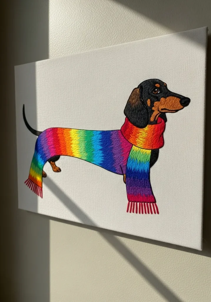 This embroidered artwork features a charming dachshund wearing a bright rainbow sweater that stretches across its long body. The clean background allows the vivid stripes of red, orange, yellow, green, blue, and purple to take center stage. The smooth stitching on the sweater contrasts nicely with the darker thread used for the dog’s fur, creating a fun visual balance. Mounted simply against a light wall, it feels cheerful and modern.