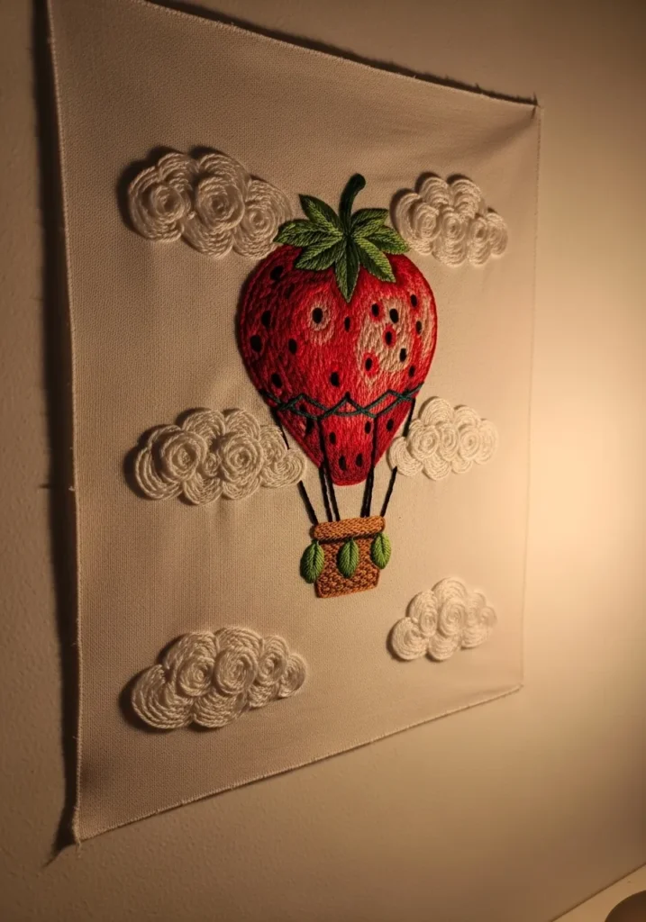 This imaginative embroidery piece transforms a bright red strawberry into a whimsical hot air balloon floating among soft stitched clouds. The textured seeds on the strawberry add charming detail, while subtle shading gives it dimension. Puffy cloud stitches surround the balloon, creating a dreamy sky scene against neutral fabric. Displayed on a simple wall, the warm lighting enhances its cozy feel.