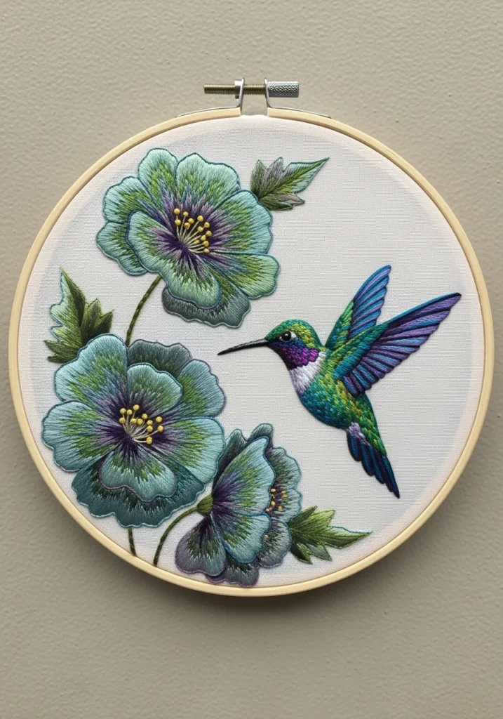 This delicate embroidery hoop features a graceful hummingbird hovering near large blue and purple blossoms. The fine threadwork in the wings creates movement, while layered stitches in the petals give the flowers depth and softness. The clean background keeps the focus on the vibrant bird and blooms, all framed neatly in a wooden hoop.