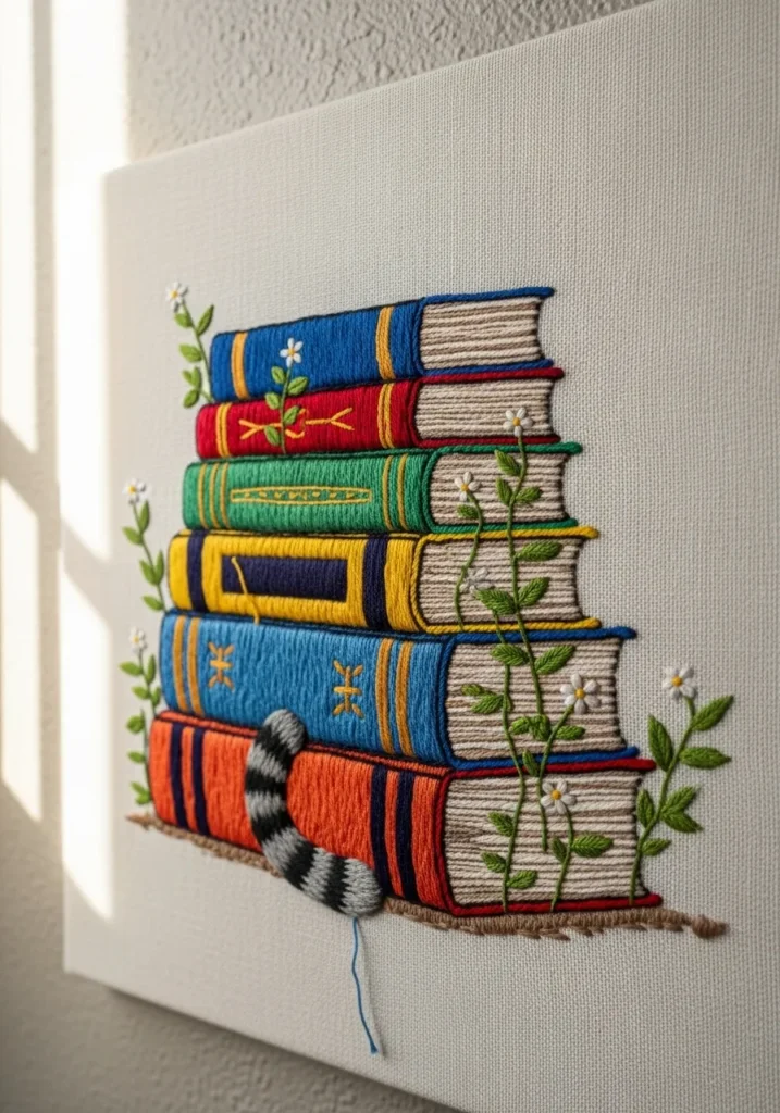 As someone who loves both books and crafts, this design makes me ridiculously happy. It feels cozy and intellectual but still playful. If you want wall art that shows off your personality, a stitched book stack is such a creative choice.