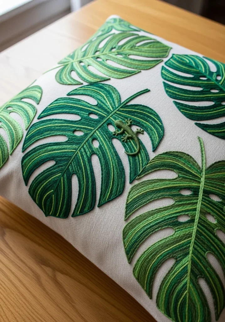 This bold embroidered pillow features oversized monstera leaves stitched in rich shades of emerald, forest, and soft sage green on a crisp white fabric base. The layered threadwork gives each leaf depth and texture, with visible stitch direction adding beautiful dimension. The clean square shape keeps it modern, while the vibrant botanical design instantly draws the eye and feels fresh and lively.
