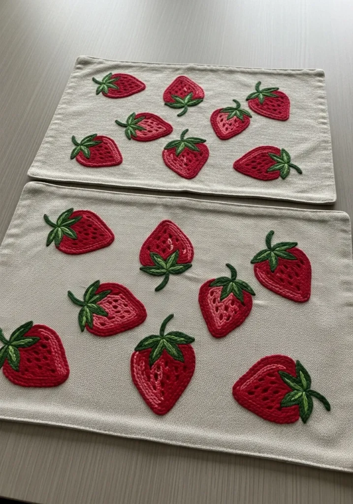 These embroidered placemats feature bold, juicy strawberries stitched in vibrant red thread with layered detailing that gives each fruit a slightly raised and textured look. The tiny seed stitches and subtle shading add depth, while the leafy green tops bring a fresh pop of contrast against the natural linen fabric. The simple rectangular shape keeps the design clean and modern, letting the playful strawberry pattern take center stage.