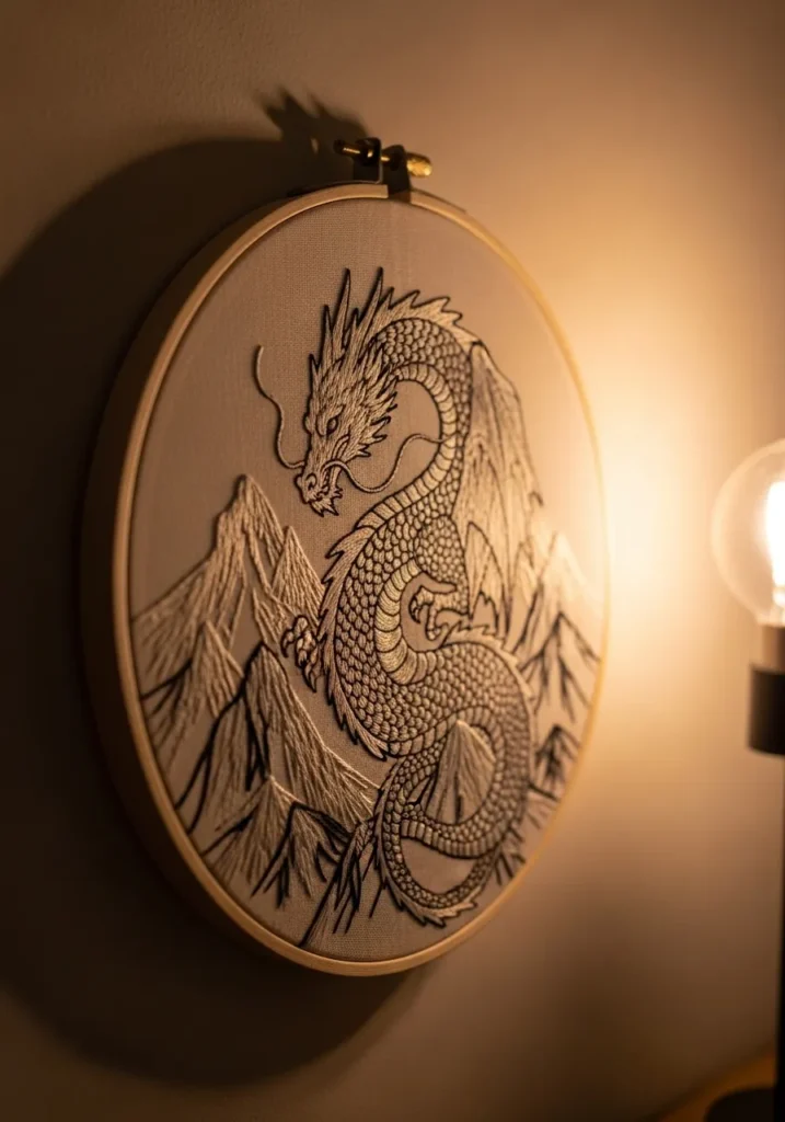 This striking embroidery hoop features a detailed dragon stitched in bold dark thread against a neutral fabric background. The scales, wings, and flowing lines are created with fine linework and subtle shading stitches that add depth and movement. Framed in a wooden hoop and softly lit, the piece feels dramatic and artistic.