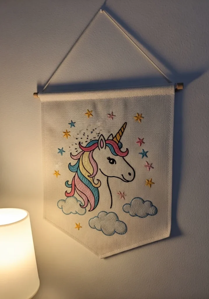 This fabric wall banner features a pastel unicorn with a flowing mane in soft pinks, blues, and purples, surrounded by tiny stars and fluffy clouds. The embroidery adds texture to the mane and horn, making the character pop against the light fabric background. The hanging rod detail gives it a sweet storybook vibe.
