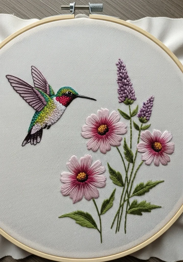This embroidery hoop captures a delicate hummingbird mid hover beside soft pink cosmos flowers and lavender sprigs. The bird shimmers in greens and jewel toned purples with carefully layered stitches that give its wings a lifelike softness. The petals are built with smooth satin stitches and gentle shading, while the leaves show fine vein details that add texture and depth against the clean neutral fabric.