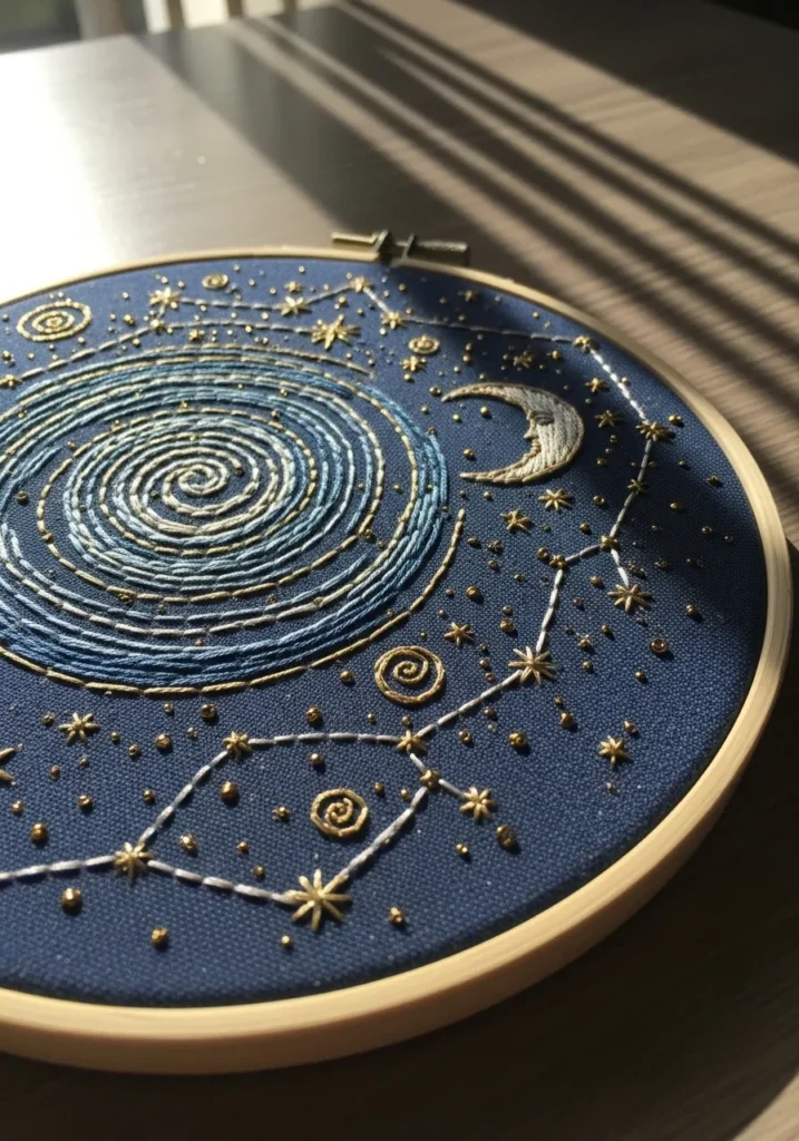 This embroidery hoop showcases a deep blue night sky filled with swirling galaxy patterns and delicate constellation lines. Tiny stitched stars scatter across the fabric, and a crescent moon glows softly in pale thread. The circular motion of the stitches adds movement and depth to the cosmic scene.