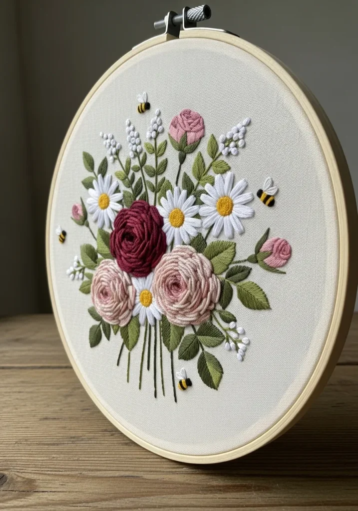 This embroidery hoop features a lush bouquet of blush and deep burgundy roses surrounded by tiny white daisies and soft green leaves. The petals are stitched with layered satin and long and short stitches that create beautiful depth and realistic folds. Small embroidered bees float gently around the flowers, adding a whimsical touch to the classic floral arrangement. The neutral fabric background makes the rich pinks and greens stand out even more.