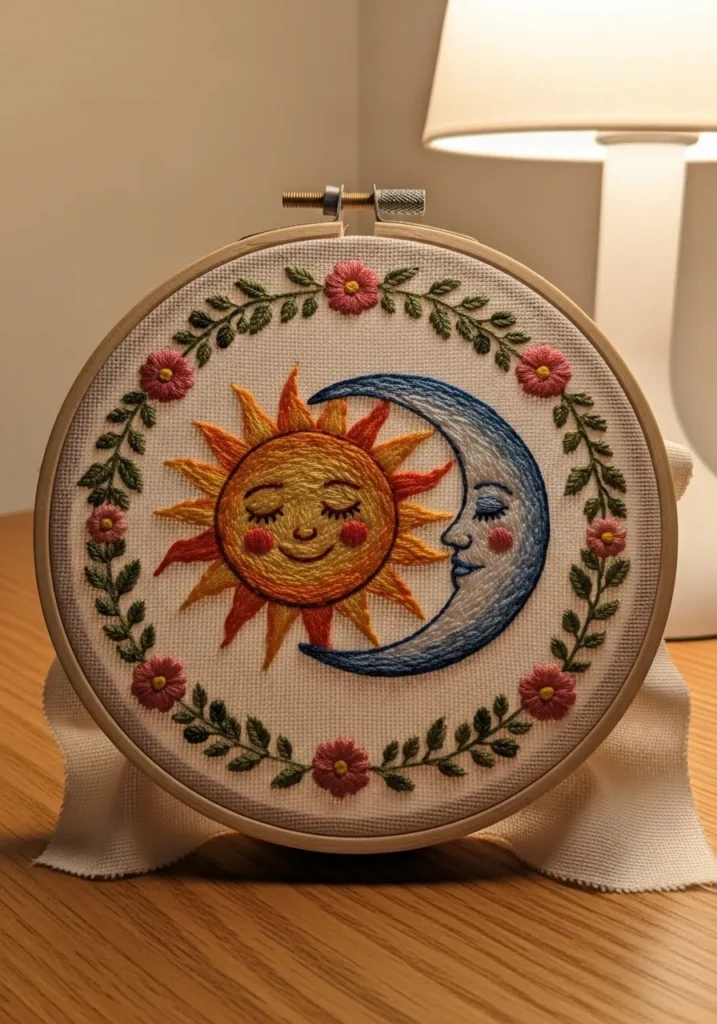 This embroidery piece features a smiling golden sun and a peaceful blue crescent moon nestled together inside a floral border. The sun’s rays are stitched in radiant yellows and oranges with subtle shading, while the moon has gentle gradients of cool blues. Tiny flowers and leaves circle the celestial duo, tying everything together in a balanced composition.