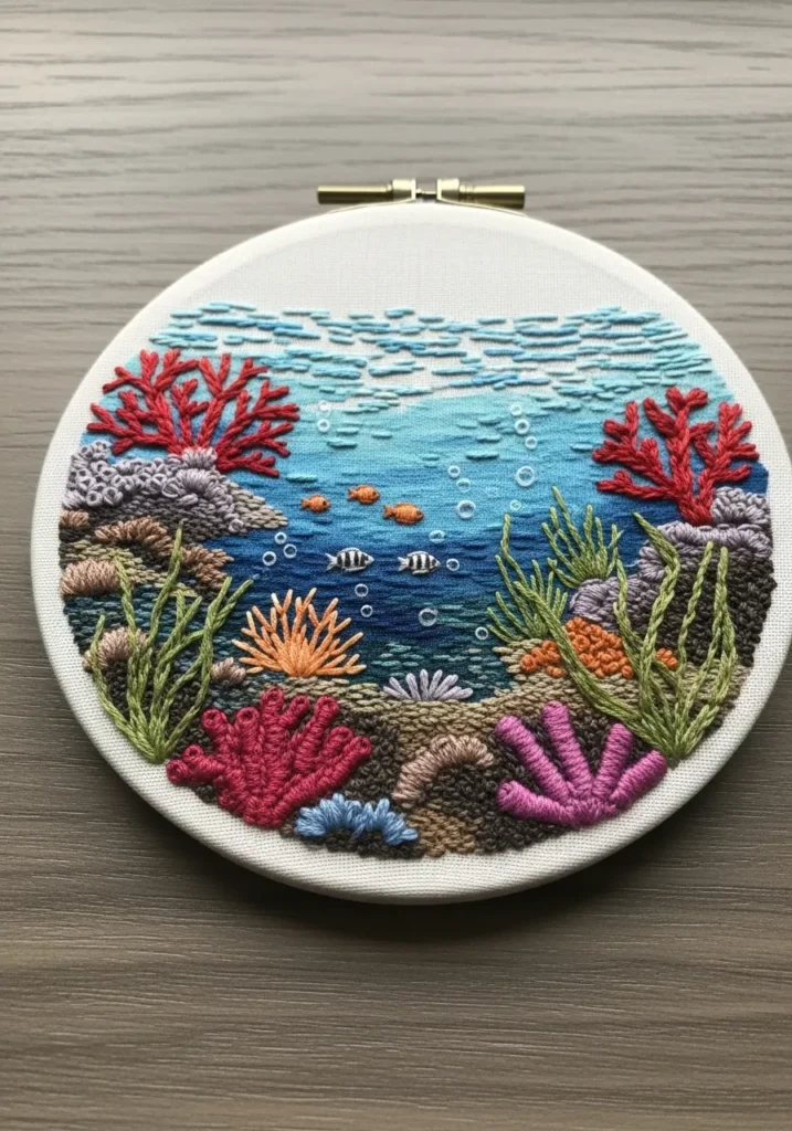 This hoop displays a colorful underwater world filled with coral in reds and pinks, soft blue water, and textured sea plants swaying gently. The ocean floor is built with layered stitches that add depth, and tiny fish details bring the scene to life. The variety of textures makes the piece visually rich and dynamic.
