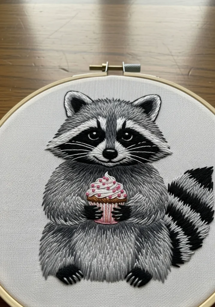 This embroidery features a fluffy raccoon holding a small cupcake with pink frosting. The fur is stitched in shades of gray with fine directional lines that create volume and softness. The cupcake adds a pop of color and a playful contrast to the realistic animal portrait.