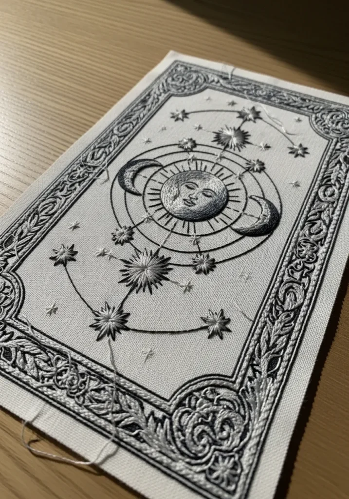 This detailed embroidery resembles a vintage tarot card with intricate borders, constellation lines, and symbolic celestial elements. The design uses fine black thread for line work, creating a delicate illustrated effect against the neutral fabric. Small stars and ornamental details fill the space with precision.