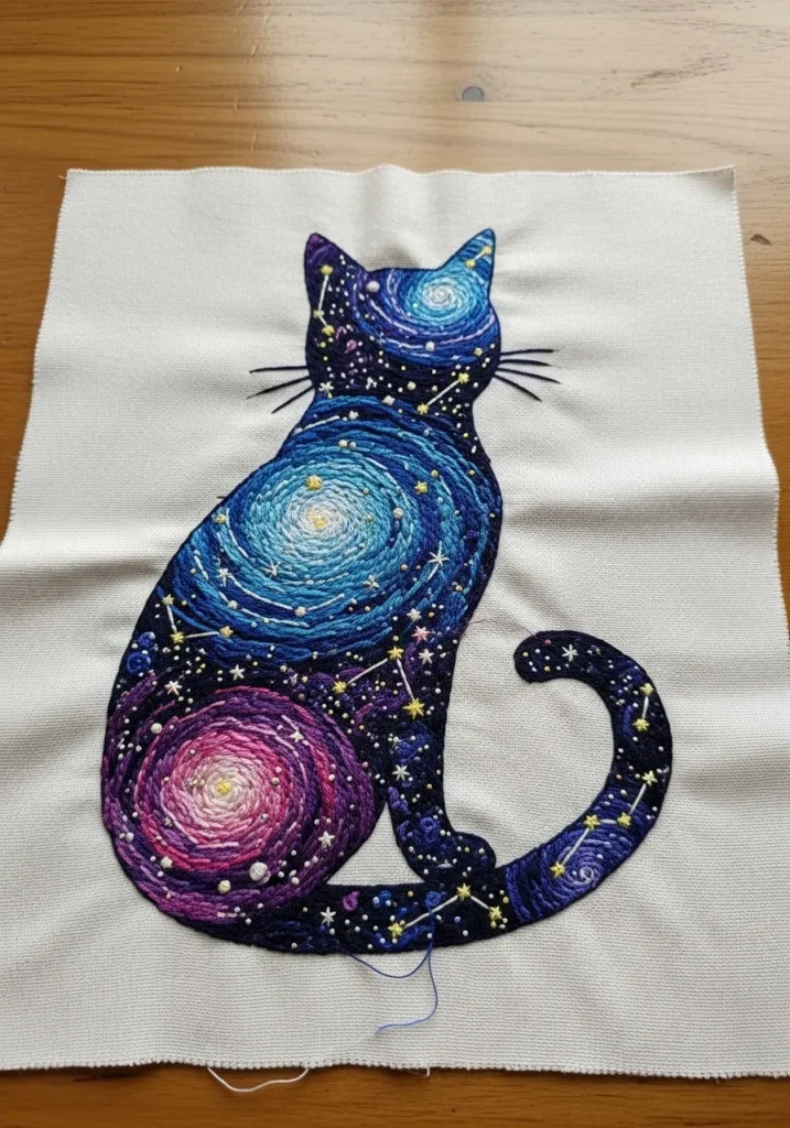 This striking embroidery piece features a seated cat silhouette filled with swirling galaxy patterns in deep blues, purples, and glowing pinks. Tiny stitched stars scatter across its body, and the spiral galaxies are layered with tight circular stitches that create beautiful movement and depth. The contrast between the dark cosmic colors and the light fabric background makes the design pop instantly.