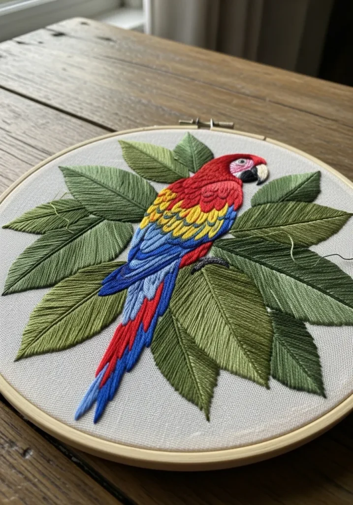 This vibrant embroidery hoop showcases a bright red, blue, and yellow parrot perched among large green leaves. The feathers are stitched with smooth layered techniques that highlight color variation, while the leaves feature detailed veins and subtle shading. The contrast between the bold bird and the fresh greenery makes the piece pop.
