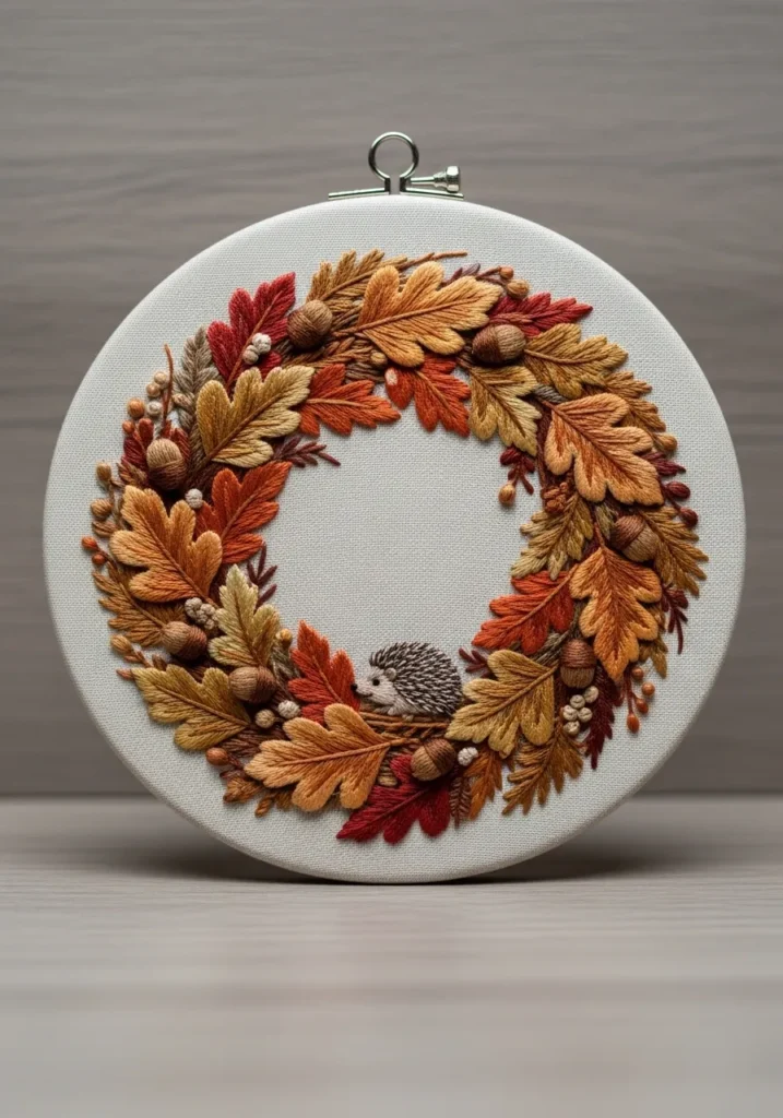 This hoop features a rich wreath made of layered autumn leaves in warm shades of orange, rust, and golden brown. Each leaf is stitched with visible veins and subtle shading that creates dimension. A small hedgehog tucked at the bottom adds an adorable seasonal accent.