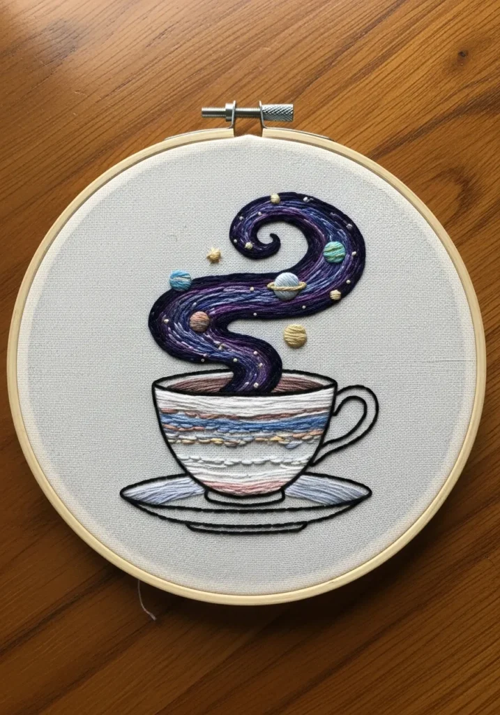 I think this one is such a fun twist on a classic object. It gives you the chance to practice clean outlines on the cup and playful free flowing stitches in the steam. It feels cozy and magical at the same time, which makes the whole stitching process extra enjoyable.