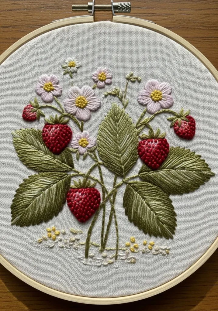 I adore working on pieces like this because they let me practice small repetitive details like French knots. It is such a great way to build consistency in my stitches. Plus, strawberries always make a design feel sweet and playful.