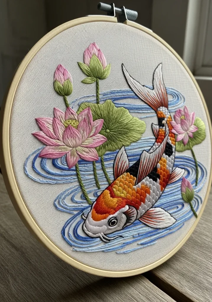 This embroidery hoop captures a vibrant koi fish swimming among pink lotus flowers and gentle blue water ripples. The fish scales are carefully layered in orange, white, and black threads, creating realistic depth and shine. The water is stitched with curved lines that guide the eye around the hoop, adding beautiful movement to the design.